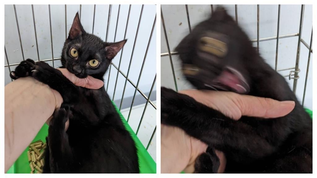 從新北市板橋動物之家網站中,能看到小黑貓的進所原因為「民眾拾獲」,拾獲地點為板橋區浮洲橋,自4月9日開放認養,不過讓人眼睛一亮的,還是工作人員替小黑貓拍攝的照片,原來牠在拍照時,不斷抓著工作人員的手玩耍,其中一張作勢要咬工作人員手的照片更是「興奮到模糊」,崩壞照片曝光後,立刻在各大社團掀起討論,吸引超過7000名網友按讚,被小貓可愛的模樣給征服。