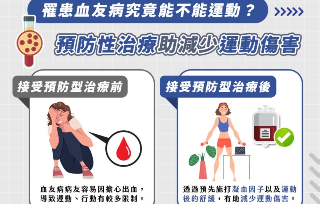 血友病病友容易因擔心出血,在日常活動的選擇上較為保守,或因為出血導致行動有較多限制,其實,規律的運動能夠幫助建立健康的骨骼與支撐關節的肌肉,有助於預防出血和關節損傷,配合適當的治療,仍可進行適當的鍛鍊運動,強化肌耐力與體能。