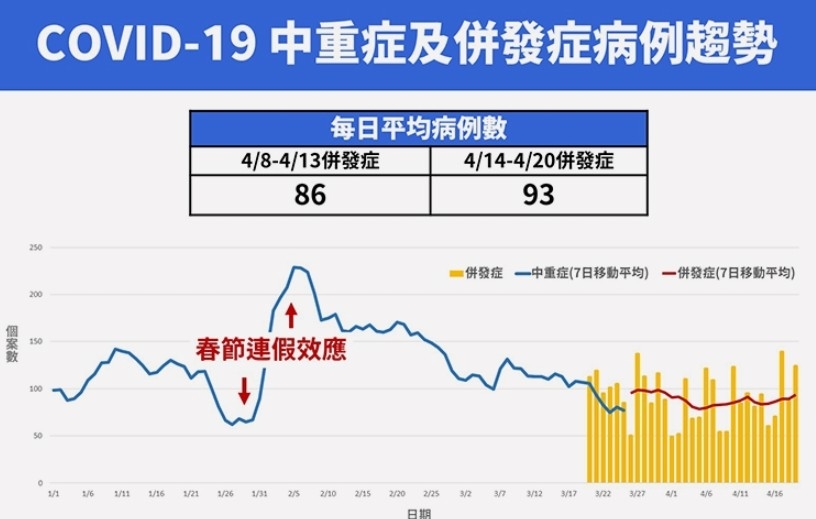 中央流行疫情指揮中心今(20)日公布國內自3月20新制實施後,上週(4/14-4/20)每日平均新增93例重症的COVID-19本土確定病例,較前一週(4月8日到13日)之每日平均新增86例略升。上週平均每日新增13例死亡,也比4月日8到13日之每日死亡平均數17例略降;死亡個案中,99%具慢性病史、63%未打滿3劑疫苗、95%為60歲以上。綜合通報趨勢、醫療資源使用情形、口服抗病毒藥物開立數及住宿式機構陽性率等指標研判,疫情持續處於低點。