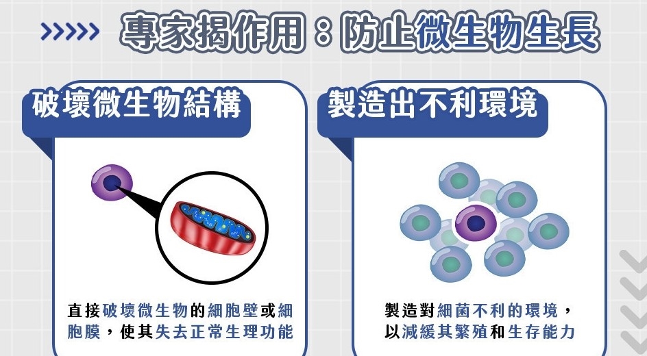 總的而言,防腐劑主要有兩大作用機制:一為直接破壞微生物的細胞壁或細胞膜,使其失去正常生理功能,進而影響微生物生長;二是製造對細菌不利的環境,以減緩其繁殖和生存能力,導致微生物的數量下降,達到防腐的效果。