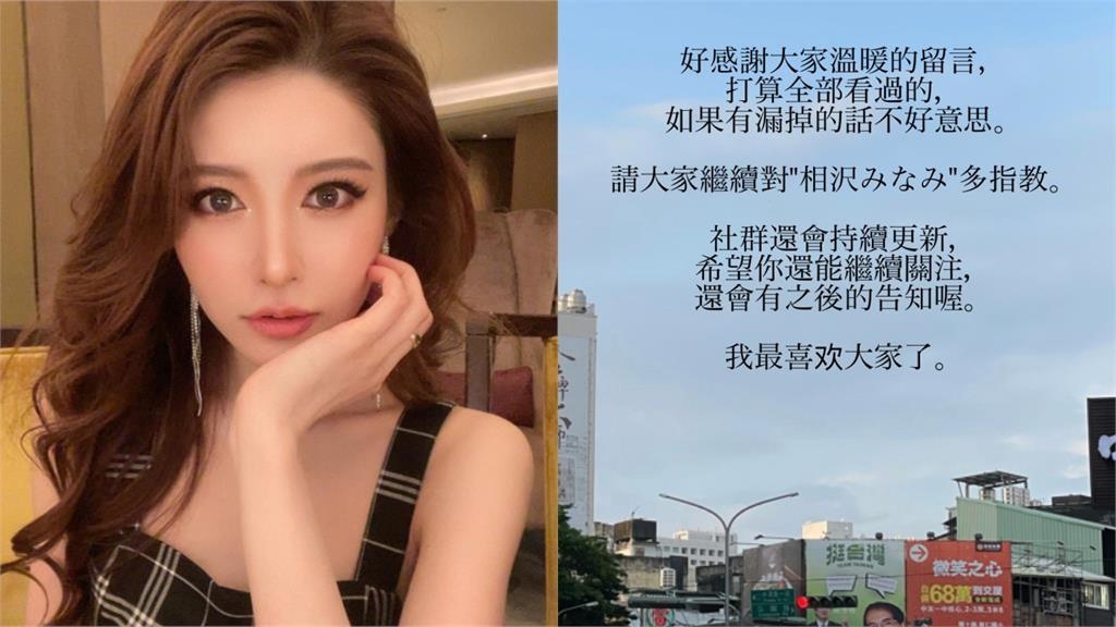 相澤南6日在推特發文,特地拍下台灣街景照片,以日文、英文、中文,一共3種語言寫下「我回到日本了!好感謝大家溫暖的留言,打算全部看過的,如果有漏掉的話不好意思」,並請大家繼續關注她,強調「希望你還能繼續關注,還會有之後的告知喔」,並甜蜜向粉絲喊話「我最喜歡大家了」。