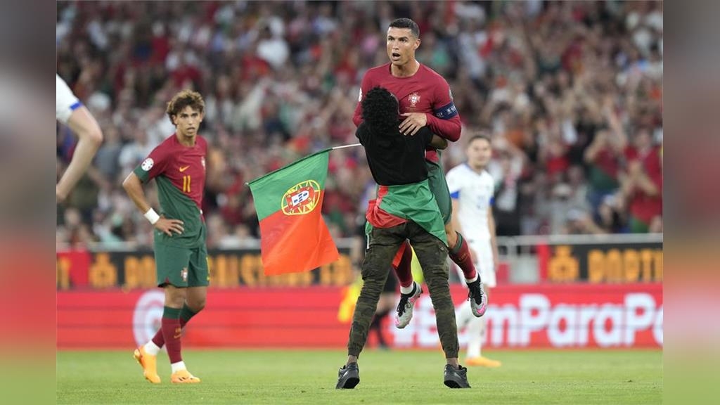 綜合外媒報導,歐洲盃預選賽週六晚間迎來葡萄牙對陣波士尼亞與赫塞哥維納的比賽,C羅以隊長身分代表國家出賽,沒想到比賽進行到下半場時,突然有一名球迷手持葡萄牙國旗亂入,不僅緊緊抱住C羅,隨後更跪倒親吻他的腳,再把C羅抱起來舉高高,眼看保全就要過來驅趕,這名球迷擺出C羅招牌慶祝動作「Siu」,接著開始跑給保全人員追。