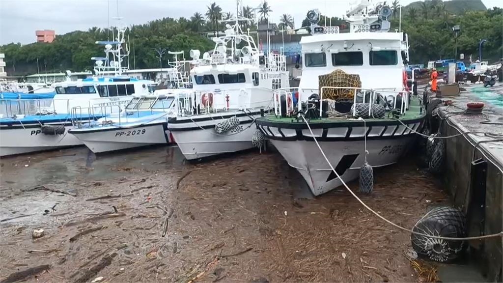 大批漂流木,湧入台東富岡漁港,堆積徘徊在港口裡頭出不去,就是因為縣內所有溪流暴漲,河床上的漂流木沖到海邊,包圍貨輪跟海巡艦艇停泊處,船隻動彈不得。