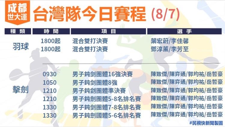 第31屆成都世界大學運動會(世大運)7月29日點燃戰火,即將於明(8)日落幕,台灣隊網球混雙組合吳芳嫺/許育修昨(6)日深夜力退中國組合,一場比賽收下3金入袋,精彩絕倫,目前台灣隊已累積9金16銀17銅,《民視新聞網》也整理今(7)日的賽程,包含羽球、擊劍、游泳項目,都有台灣戰將出賽,而眾所矚目的台灣隊羽球混雙「金包銀」內戰,將在今晚6時登場。