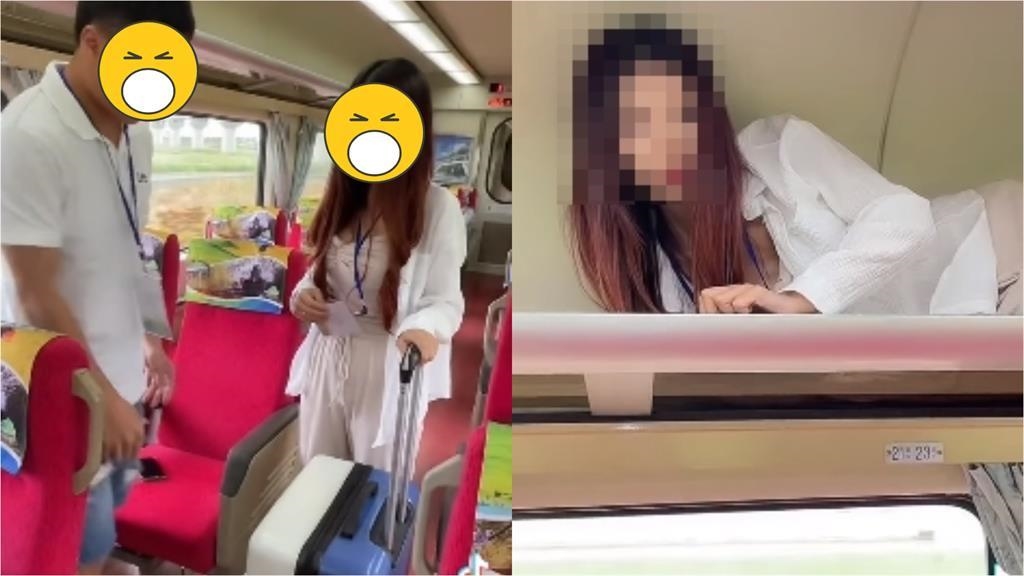 臉書社團「台灣便當管理局-附屬鐵路部」今(13)日轉發一部抖音片,一名身穿全白套裝的長髮正妹,拖著約莫24吋的行李箱走在疑似是台鐵莒光號的走道上,她走向自己的座位並和一旁的白衣男子說「先生不好意思,可以幫我放上去嗎?」。就當眾人以為是要幫正妹把行李箱放到行李架上時,畫面一轉,竟是正妹整個人塞進行李架內,誇張的行為立即掀起網友熱議。