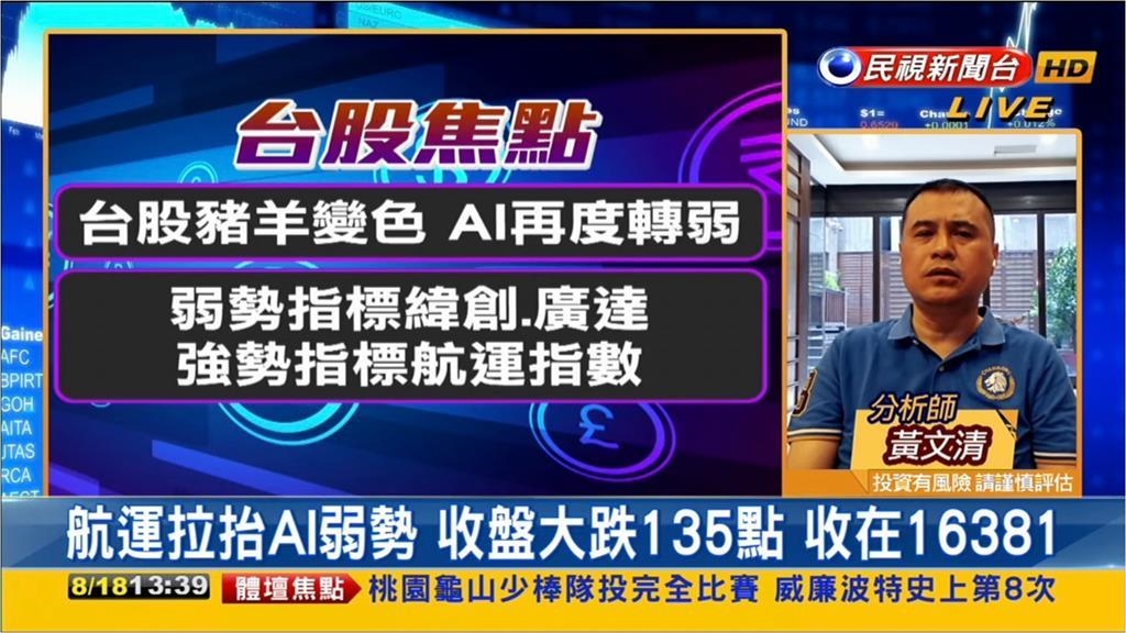 財經中心/曾郁雅報導今(18日)台股「豬羊變色」,收盤大跌135點,最終指數收在16381點,跌幅0.82%,分析師黃文清指出,這兩日台股一直在半年線上下反彈,不過力道有所限制,尤其AI族群的表現又再度轉弱,面對不少負面因素影響的台股是否能在近期告一段落,還要看台灣本身強勢的族群表現,其中短期有反彈契機的則是「這族群」。