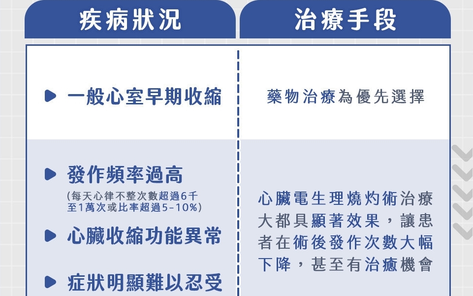 「心室早期收縮」是由心室的異位節律點發出激動波使心室提早收縮,而一般來說,心室早期收縮並不會造成生命危險,因此藥物治療仍是優先的選擇,但在某些狀況下,如發作頻率過高(每天心律不整的次數超過6,000-10,000次或比率超過5-10%)、心臟收縮功能異常、以及症狀明顯難以忍受的病人,電生理燒灼術治療大都能收到立竿見影之效果,讓病人在術後的發作次數大幅下降,甚至治癒。