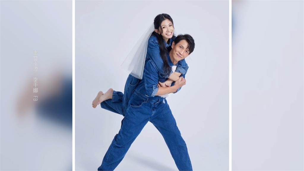 藝人李千娜頭戴白紗,和黃尚禾身穿牛仔情侶裝,露出甜蜜笑容,另一張照片小倆口還十指緊扣,大方秀出婚戒,宣告結婚。
