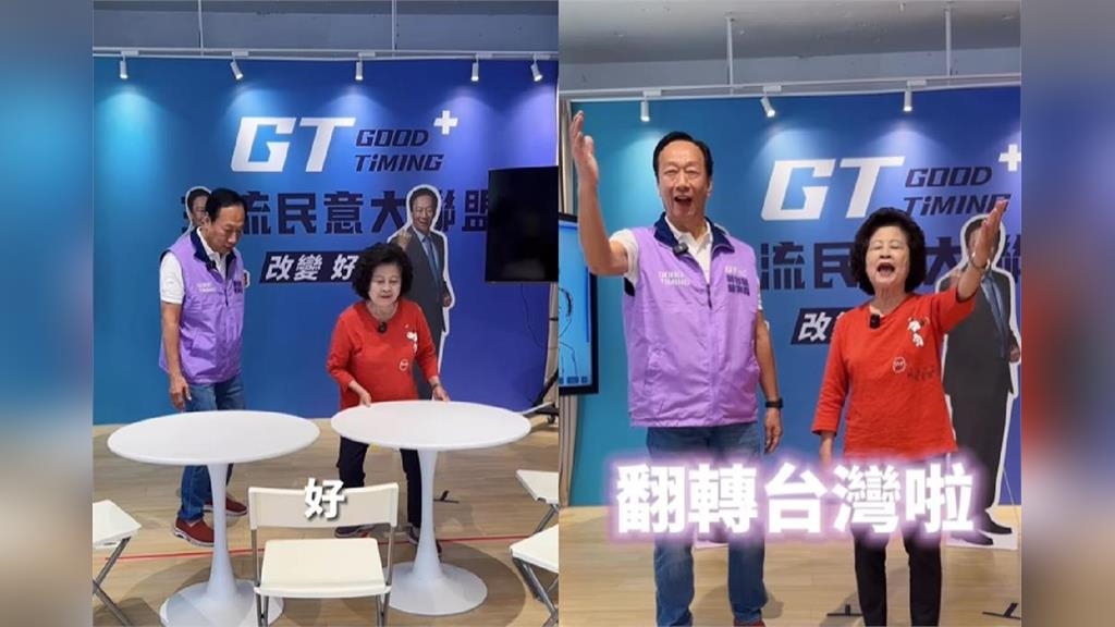 接著「哩賀阿嬤」與郭台銘站在連署站的桌椅前,阿嬤親切地以「弟弟」稱呼郭董並說,「我翻桌給你看,讚啦!」這時郭台銘也照做「翻桌」喊讚,兩人一起高喊要「翻轉台灣」。