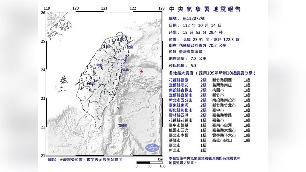 即時中心/李昶毅報導地牛翻身!根據中央氣象署資訊,今(14)日15時53分台灣東部海域發生規模5.3地震,震央位於花蓮縣政府東方70.2公里處,震源深度7.2km,最大震度2級;北部明顯「左右狂搖」數秒。