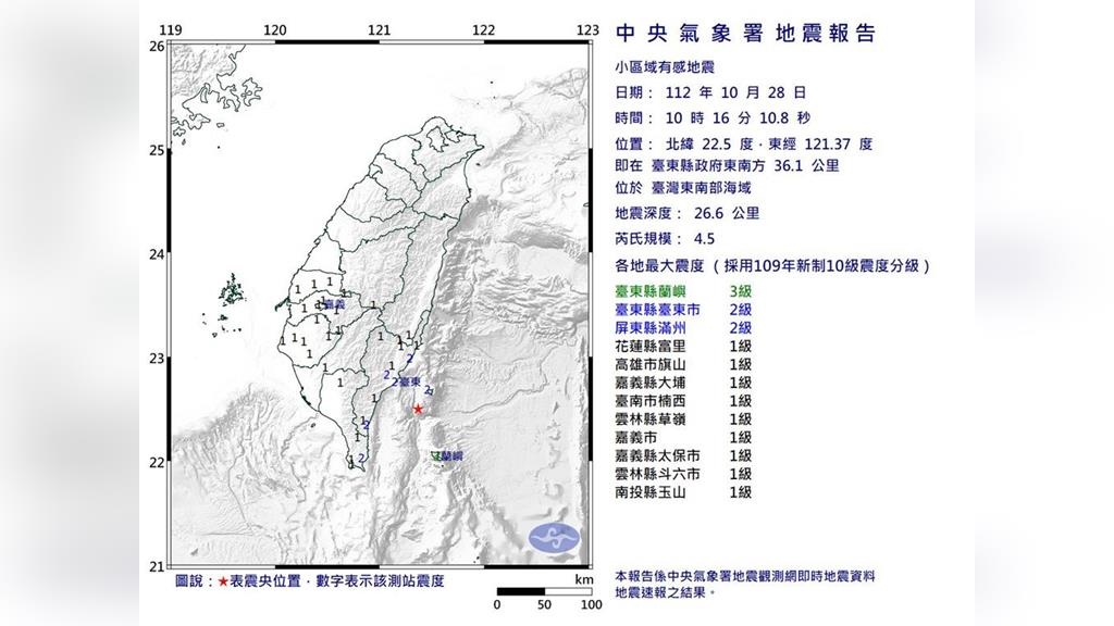 根據中央氣象署資料,台灣東南部海域今(28)日上午10時16分發生有感地震,震央位於台東縣府東南方36.1公里處,芮氏規模4.5,深度26.6公里,各地最大震度蘭嶼、台東3級;屏東2級;花蓮、高雄、嘉義、台南、雲林、南投1級。