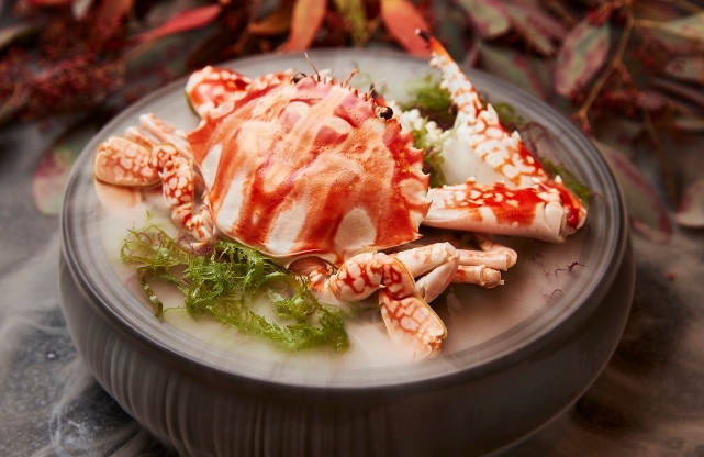有「新北第一粵菜」之稱的望月樓,由港籍主廚蘇權暉親手操刀,擅長賦予經典菜色新靈魂的他,為萬里蟹量身打造專屬菜色《一蟹知秋》,其中「沙茶皮蛋三點蟹煲」以混合了沙茶醬、顆粒花生醬、椰漿、奶水炒製的港式沙茶火鍋的湯底為原型,加入香港經典湯品中的皮蛋燜煮三點蟹,並以粉絲為底吸附滿滿的精華湯汁;「金湯雪蛤蟹肉豆苗」為手工菜的代表,以熬煮多時的濃郁雞湯、南瓜泥製作金湯,以萬里蟹肉、雪蛤、蛋白勾芡製作料頭,以幼嫩豆苗加雞油快炒,用米酒、薑汁等調味,最後擠出水分放入金湯並淋上雪蛤蟹肉,費工費時淬鍊出鮮甜滋味。