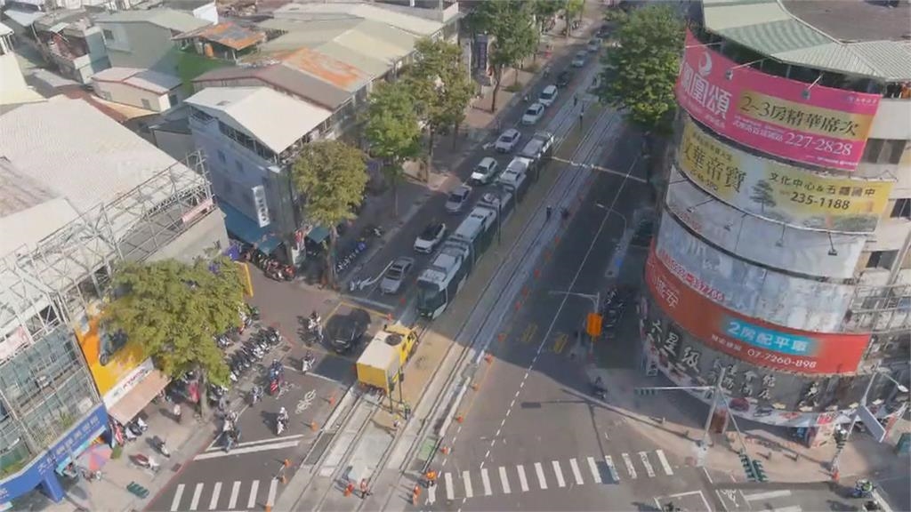 從空中俯瞰,高雄輕軌新站與舊站間,列車正式上線測試,輕軌成圓即將美夢成真。