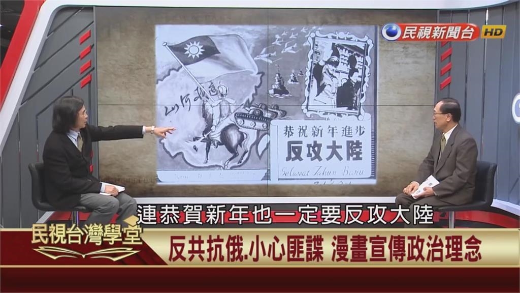 在還有「三民主義」課程的年代,大家對於「蔣總統看小魚逆流而上」的內容都不陌生,藉由課文做政治宣傳,提升蔣介石在莘莘學子心中的地位。此外,還有許多宣傳反攻大陸的漫畫,除了四個大字隨處可見,甚至有些文宣品會在下面加一行馬來語,足見宣傳到海外的意圖。