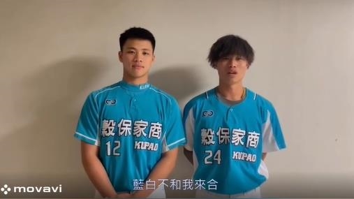 穀保家商將在12月24日舉行OB賽,找來孫易磊及林昱珉拍片宣傳,2人穿著背面一藍一白的球衣,大搭時事哏,喊出,「藍白不和我來合」、「穀保OB賽,三重棒球場藍白正式結合!」影片曝光後讓網友笑翻,直呼,「笑死,懂玩」。
