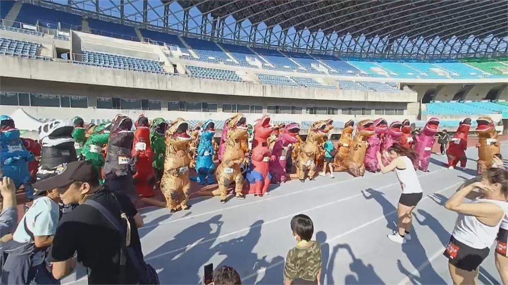 高雄富邦馬拉松上午在高雄國家體育場登場,第一天進行的是休閒組和恐龍田徑賽。其中恐龍田徑賽是首次舉辦,吸引一百多位民眾穿著恐龍裝來參加,競速一百公尺。但恐龍裝會阻擋視線,衣服也會拌到腳,就有不少選手摔倒,還有人是匍匐抵達終點,十分有趣,高雄市運發局長侯尊堯也親自下場體驗。