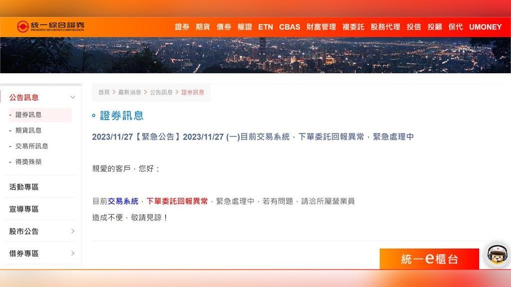 統一證則在接近中午時段,於官方網站發布公告,指出目前交易系統出現下單委託回報異常,正緊急處理中。
