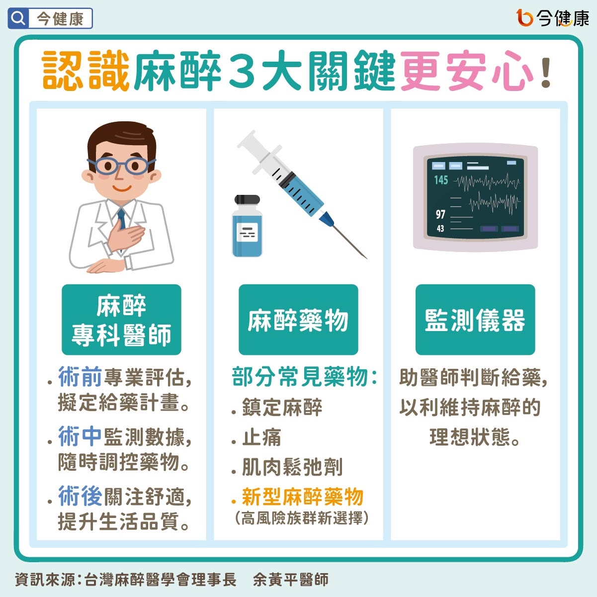影響麻醉安全的因素眾多,因此麻醉專科醫師會完成術前評估並規劃最適切的麻醉方式,有了前期充分的溝通就能積極避免術後可能的副作用。余黃平醫師表示,只要掌握「認識你的麻醉專科醫師」、「了解麻醉藥物計畫」及「認明有監測儀器的醫療院所」的三大關鍵便能安心治療。