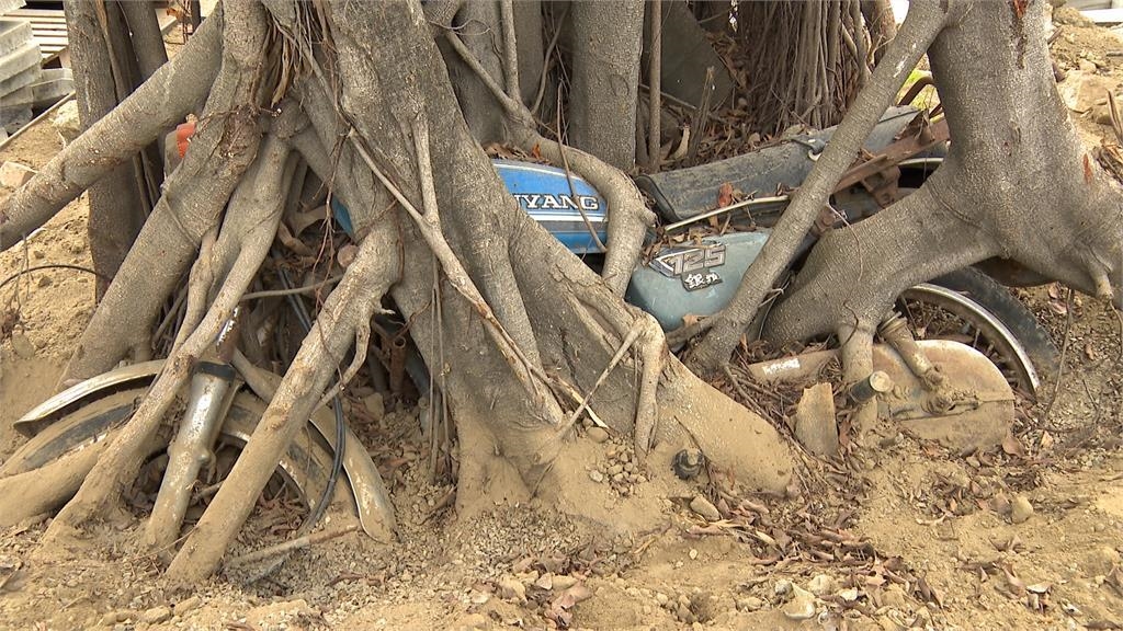 今年12月,園區將以國漫館身分開幕,這奇妙景象,意外成為焦點,另外在台中文學館,也出現了類似奇景,只不過榕樹包覆的不是機車,而是腳踏車。