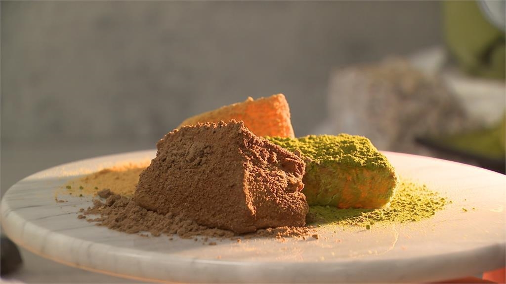 柔軟Q彈的蕨餅,令人食指大動,除了沾滿黃豆粉,也能換成抹茶或巧克力口味,而入口即化的秘訣,就是將蕨餅粉、樹薯粉和特製糖粉,倒入90度熱水裡,均勻攪拌到凝固。