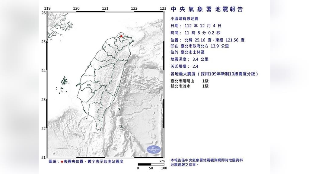 中央氣象署表示,台北市士林區今(4)日上午11時08分發生有感地震,芮氏規模2.4,震央位於台北市政府北方13.9公里,地震深度僅3.4公里,最大震度陽明山1級。