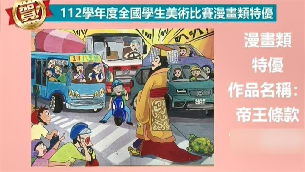 古代皇帝閉著眼睛慢慢走在斑馬線上,手上還牽著一隻烏龜,一旁的汽車駕駛們狂按喇叭,機車騎士也好無奈!這是桃園市國中生參加全國學生美術比賽的得獎作品,以「帝王條款」為名,用詼諧有趣的方式呈現,龜速過馬路、無視汽機車的行人,如同皇帝。民眾:「車子看到人,一定先讓人過,可是也不能慢慢走,在那邊滑手機。」