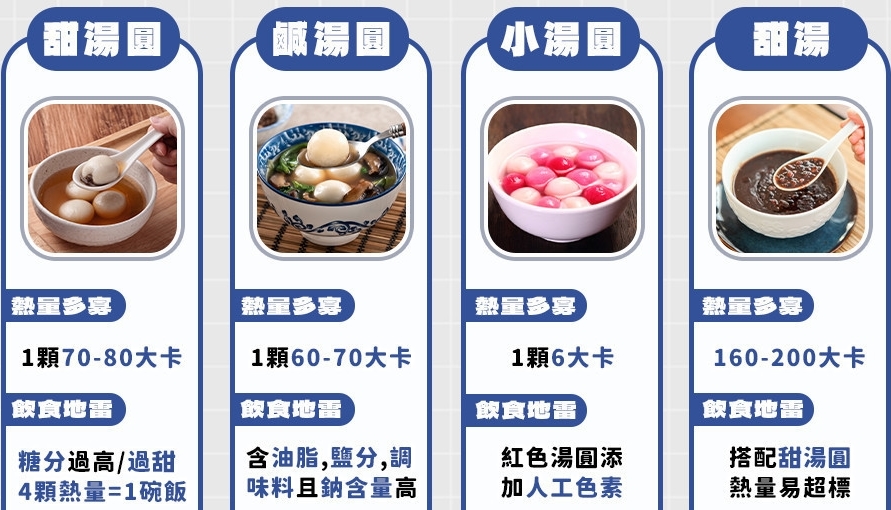 嫚嫚營養師曾接受《潮健康》專訪指出,市售湯圓主要為包餡的大顆湯圓及未包餡的小顆湯圓。包餡湯圓以甜、鹹兩種口味居多,最多人愛吃的甜餡料湯圓如芝麻、花生、牛奶糖、流沙湯圓,一顆(20公克)即含有70-80大卡的熱量,多吃4顆湯圓就等於一碗白飯280大卡的熱量。