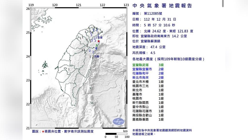 根據中央氣象署地震測報中心的資料,今天早上5時57分,宜蘭縣蘇澳鎮發生芮氏規模4.5的地震,震央位於宜蘭縣政府南南東方14.2公里處,深度為47.4公里,屬於淺層地震。