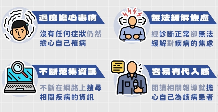 如果瞭解自己是否可能有慮病症傾向?慮病症的明顯徵兆包括:一、沒有認何症狀仍擔心自己罹病;二、經醫師診斷身體狀態正常仍無法緩解對疾病的焦慮;三、不斷在網路上搜尋相關疾病資訊;四,閱讀相關疾病的新聞報導就開始擔心自己為該疾病患者;五、對健康的擔心影響到生活、家庭、工作與社交生活。