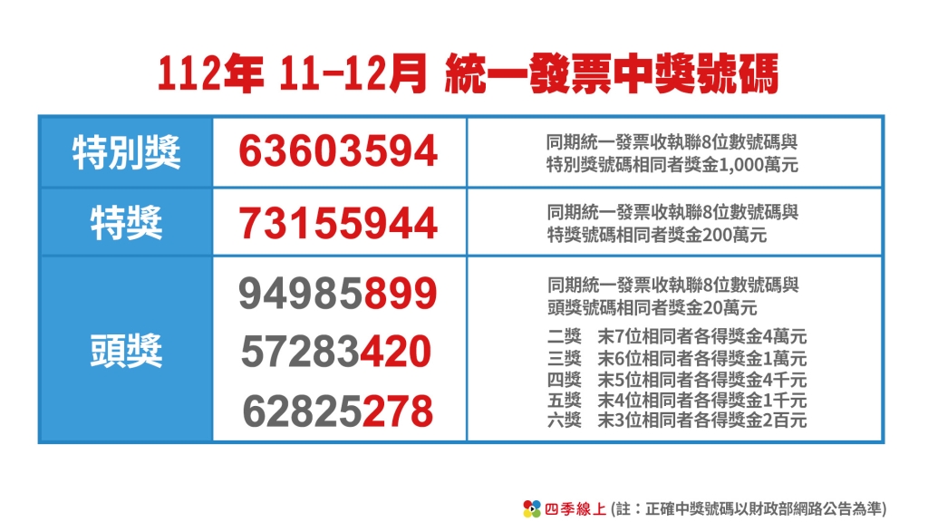 最新一期統一發票開獎!2023年11-12月統一發票獎獎號今天公布,千萬特別獎中獎號碼為「63603594」;200萬元特獎中獎號碼為「73155944」,快來看看自己有沒有中獎吧!