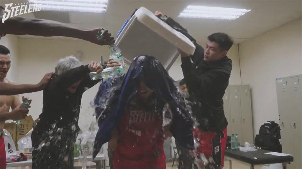 致勝英雄王律翔,回到休息室內,鋼鐵人隊友,慶祝當然毫不手軟。人手一罐開水,再搭配冰桶,王律翔被冷水伺候,就連攝影機也遭殃,賽後他透露這顆絕殺球,其實是當場的靈機應變。鋼鐵人球星王律翔:「那剛好因為傑哥去試著抄又瑋的球,所以我那時候喊又瑋,他剛好有聽到回傳給我,投出去的時候有覺得會進,但是沒想到比原本大力一點點,所以彈到後面才彈起來,(後面是我撥進去的)。」訪問尾聲,金句製造機Coach邱,來一記冷箭突襲絕殺記者會。目前戰績墊底的鋼鐵人,急需贏球提振士氣,這場逆轉勝,讓他們近3場拿下2勝,看得出來,團隊氣氛有明顯好轉。