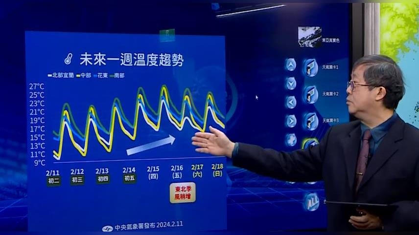 未來溫度部分,林定宜表示,今天、明天清晨受輻射冷卻效應,大致上仍比較低溫,但白天可見,北中南東溫度都呈現逐步回升,直至16日東北季風增強之前,溫度呈現逐步回暖;16日後東北季風稍微增強,北部、東北部地區溫度會再度下降到20度以下。