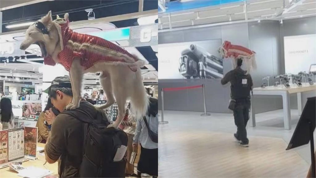 從網友分享的畫面可以看到,一名黑衣男子在百貨公司逛街時,一隻身穿紅色舞龍舞獅亮片裝、頭戴防風墨鏡的白色大狗,赫然站在男子的肩膀上,無論是主人在試用相機,或是在行走時,白色狗狗都屹立不搖的穩穩站立,而其實在月初,也有民眾直擊白色大狗與他的主人曾現身台北光華商場外圍,當時白色狗狗也是高高的站在主人的肩膀上,一度成為馬路焦點。