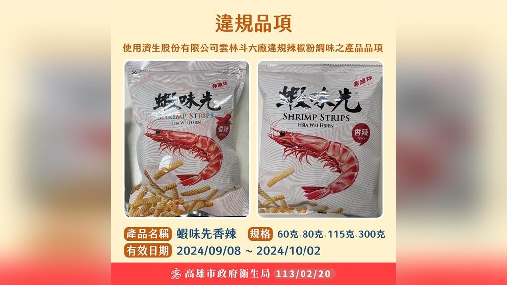 高雄市衛生局說明,派員前往裕榮食品股份有限公司,經查不合格原料共8公斤,作為調味用,已於今年1月至2月初製成「蝦味先 香辣口味」(規格60/80/115/300克,批號有效期限2024.9.8至2024.10.2)產品,共31,208.65公斤,現場已無該批不合格原料。