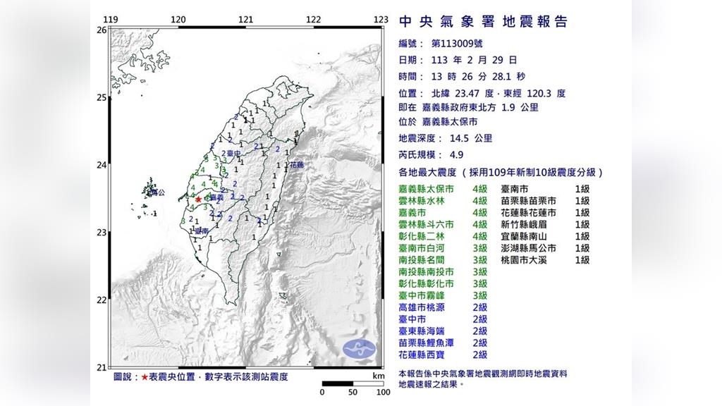 今(29)日下午1時26分,嘉南地區發生規模4.9有感地震。震央位於嘉義縣太保市,深度14.5公里,為極淺層地震,最大震度4級。