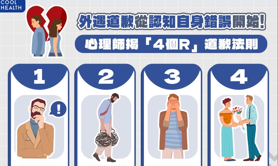 道歉要達到效果,格拉斯哥教授提供「四個R的道歉法則」,我發現這套法則非常適合用於外遇後的道歉,值得外遇者學習。