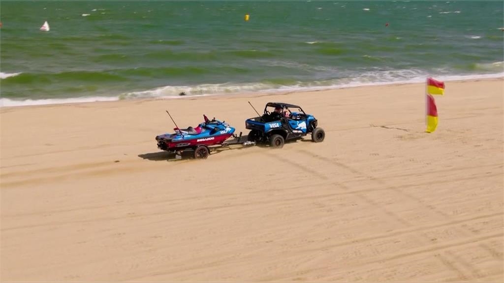 這裡是墨爾本知名的漢普頓海灘,4位F1車手,分成兩組競賽,紅牛車王維斯塔潘,和隊友培瑞茲開一輛沙灘越野車,和紅牛二隊,艾法托利的車手,里奇亞托以及角田裕毅對抗,當地的海灘救生員,則充當雙方的維修站人員,救生員平常都要開著沙灘車巡視,有時還要拖著水上摩托車前往出事地點,救援也是需要速度的,維斯塔潘不愧為F1車王,開沙灘越野車,也是有練過的。