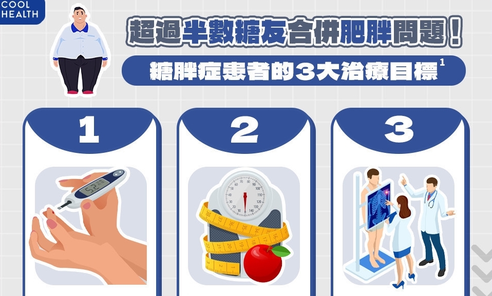 杜柏村醫師指出,「糖尿病患者中約有50%以上同時有肥胖問題1。肥胖讓血糖控制不易,還會提高大、小血管病變機率,導致中風、心肌梗塞等1;因此糖胖症患者應同時控糖、控體重才能避免更多健康危害。」近年來國際糖尿病治療指引,已將體重管理列入主要治療目標之一,可見控制體重對患者的重要性。