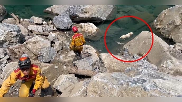 花蓮搜救犬石礫間嗅聞「突跳進溪水」! 搖尾巴游泳超萌畫面曝光