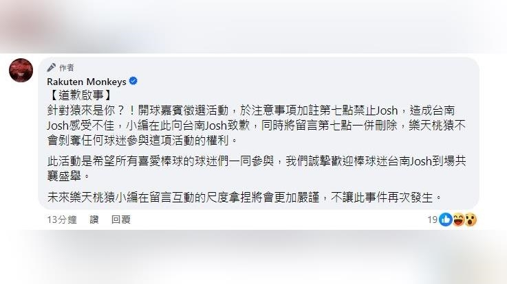樂天桃猿透過臉書粉專「Rakuten Monkeys」在原貼文底下留言發布「道歉啟事」強調「我們誠摯歡迎台南的棒球迷 Josh 出席活動,共同見證這一盛事」,並承諾未來將更加謹慎地掌握互動的範圍,對於貼文中「針對猿來是你?!開球嘉賓徵選活動,於注意事項加註第七點禁止Josh,造成台南Josh感受不佳,小編在此向台南Josh致歉」,他們已經將第7點注意事項刪除了。