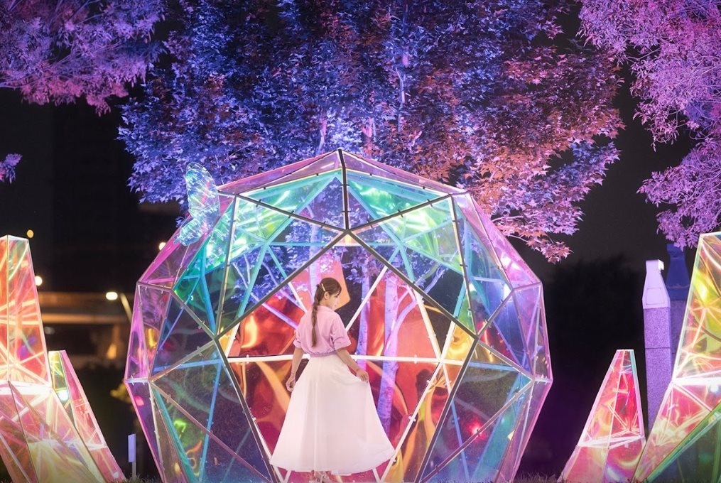 沿著三重河濱自行車道便可抵達新北大都會公園,喜歡愛麗絲夢遊仙境故事的朋友們有福了! 「花開水岸•春日藝遊展」在三重大都會公園盛大展至6月10日,展區景致絕對讓您目不暇給。本次展覽由插畫藝術家潘心屏(Hsinping Pan)和編織藝術家楊海茜攜手,以大膽用色但細緻設計之方式將童話故事的場景,於日夜間散落在春夏生機勃勃的綠地上。其中,繽紛色彩與熱情洋溢的藝術花朵讓人不禁也想遊覽「奇幻藝花園」與置身於「織夢花傘」之下。此外,公園的草坪上還有6米高的幸福熊等著和各位民眾一起野餐與合照;夜間的公園更有燈光秀,浮現似夢似真的仲夏夜島嶼。也別忘了品嚐在地美食,附近的三和夜市也有提供許多美食如阿文餛飩湯圓、蚵四海蚵仔煎以及朱記花枝羹等,為城市漫遊畫下完美的句點。