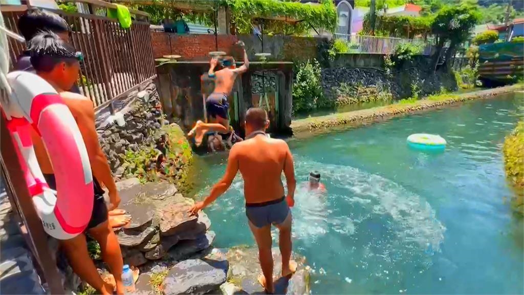玩水民眾:「(來這邊泡水不錯喔?),對來這邊泡一泡回市區比較涼。」、「吃冰、來這邊泡水、游泳。」