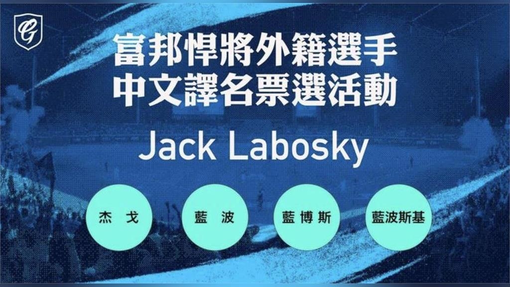 Jack Labosky預計將在近期抵達台灣,富邦悍將也結合首創的悍將APP投票系統,首度開放球迷投票選出新洋投的中文譯名,選項包括「杰戈」、「藍波」、「藍博斯」、「藍波斯基」等四個中文譯名選項,只要透過富邦悍將APP的投票系統,即可參加票選,最高票的中文譯名選項將成為Jack Labosky的中文譯名。