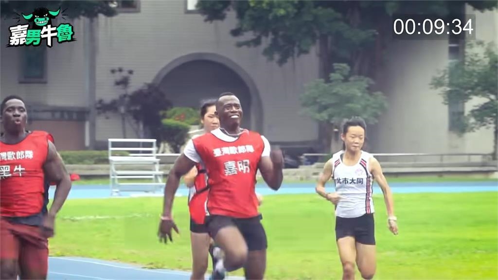 影音中心/鍾如婷報導人們一直對於黑人基因有所迷思,認為在體能上黑人人種會較其他人種更好,不過這樣的迷思只有實際較量才能得知。日前嘉明和黑牛,與曾拿全國冠軍的大同高中田徑隊的女子隊員們,一起較量田徑的成績,PK4X200公尺接力和100公尺個人賽,為湊足人數嘉明和黑牛還找來甘比亞友人Babu、Saul,一起參加比賽,黑牛在賽外賽100公尺時發憤猛力狂衝,終於率先通過終點線,教練還笑虧他像18歲。