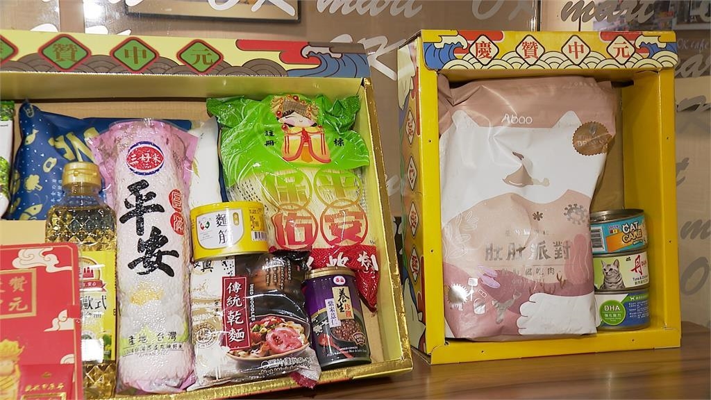 也有超商攜手兩大宮廟,鎖定忙碌上班族,推代客普度服務,懶人拜拜箱,包辦家庭主婦愛用的經典平安米、乾貨,除了直送到家,也能捐做公益,特別的是,另一箱,放了貓糧、貓罐頭,還有結緣鑰匙圈,要讓飼主,換個方式,思念毛寶貝。