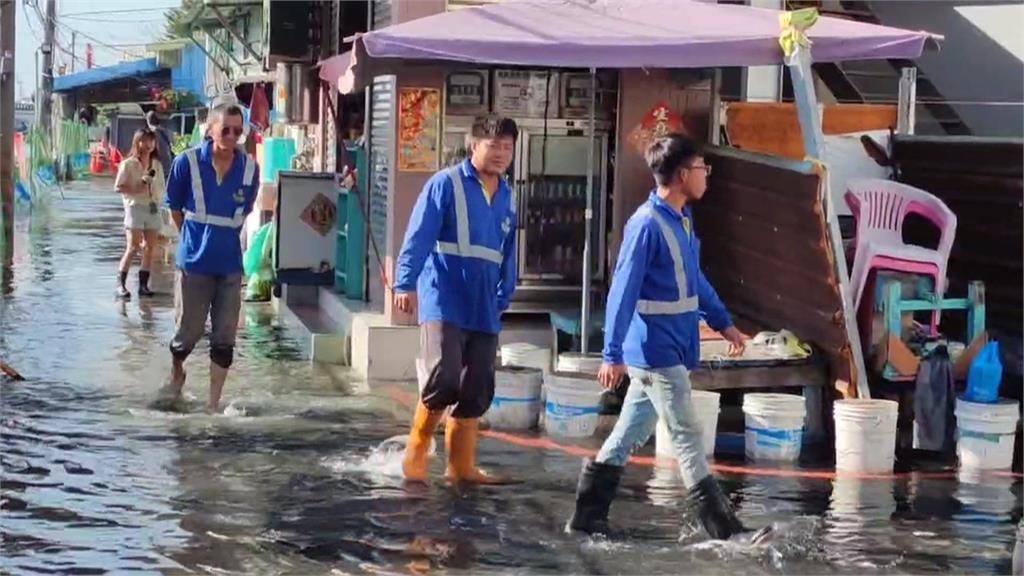 類似情況出現在屏東東港,海水同樣漫進道路,水溝附近不斷冒出水來,整個地面上都是水,甚至有的地方水快要淹進民眾的家裡,有人想要到便利商店,也是需要涉水通行,相當不方便。