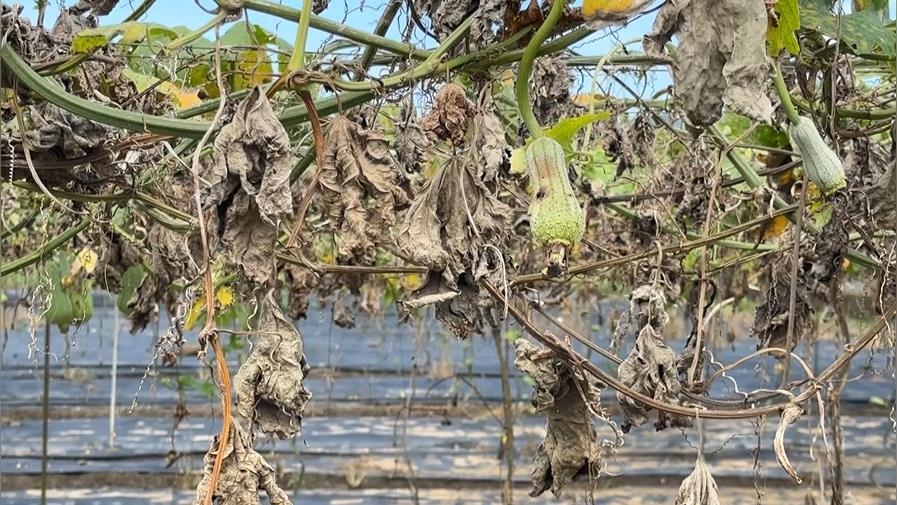 凱米颱風造成農損災情,南投魚池鄉,日月潭頭社盆地大淹水,當地種植大面積的絲瓜,水傷嚴重。瓜農說,收成量嚴重銳減,讓絲瓜產地價,一度飆破每公斤300元,換算下來一條就要超過180元。但瓜農感嘆,雖然價格好,不過量太少,對他們來說沒什麼幫助。