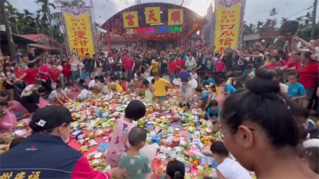 各式水果餅乾和點心,平鋪在大塑膠布上,小朋友們手拿著大袋子,等待時間一到,就能開搶。現場人員:「開始小朋友開始,大人不要下去喔把袋子裝滿喔。」小朋友忙著搶零零食糖果,大人們則是搶著接裝有摸彩券的彩球。現場人員:「來把你們的雙手舉高,幫我們丟遠一點後面的朋友。」屏東高樹大路關獨特的四孤搶粄,中元節當天在廣福村順天宮登場,預估有上千人一起參與,現場尖叫聲此起彼落,非常熱鬧,大人小孩都收穫滿滿。