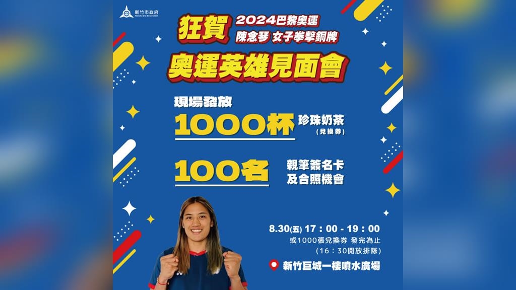 教育處表示,竹市「2024巴黎奧運英雄見面會」將於8月30日17時,在巨城購物中心噴水池廣場舉行,於16時30分開放民眾排隊,請市民朋友依現場工作人員指示排隊領取號碼牌(限量1000張),前100名可獲得親筆簽名卡片及上台合影機會,千張珍奶兌換券於現場憑號碼牌兌換。