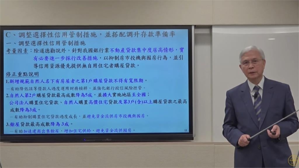 中央銀行今天舉行第3季理監事會議,決議利率「連2凍」,但調升存準率1碼,祭出第7波選擇性信用管制,新增規範自然人名下有房屋者,第1戶購屋貸款不得有寬限期,自然人第2戶購屋貸款最高成數由6成降為5成,並擴大實施地區至全國,房市管制措施自明(20)日起實施。